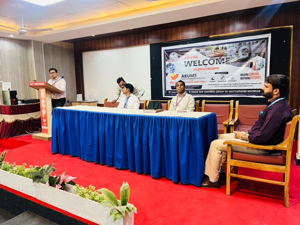 रुड़की कॉलेज ऑफ फार्मेसी में Akums Drugs & Pharmaceuticals Pvt Ltd, हरिद्वार के सहयोग से सफलतापूर्वक कैंपस प्लेसमेंट ड्राइव का आयोजन किया गया, जिसमें बी फार्मा, एम फार्मा, डी फार्मा अथवा अलाइड साइंसेज के लगभग 50 छात्रों ने उत्साहपूर्वक भाग लिया। इस अवसर पर छात्रों को प्रतिष्ठित फार्मास्यूटिकल कंपनी में रोजगार के अवसर प्राप्त हुए।