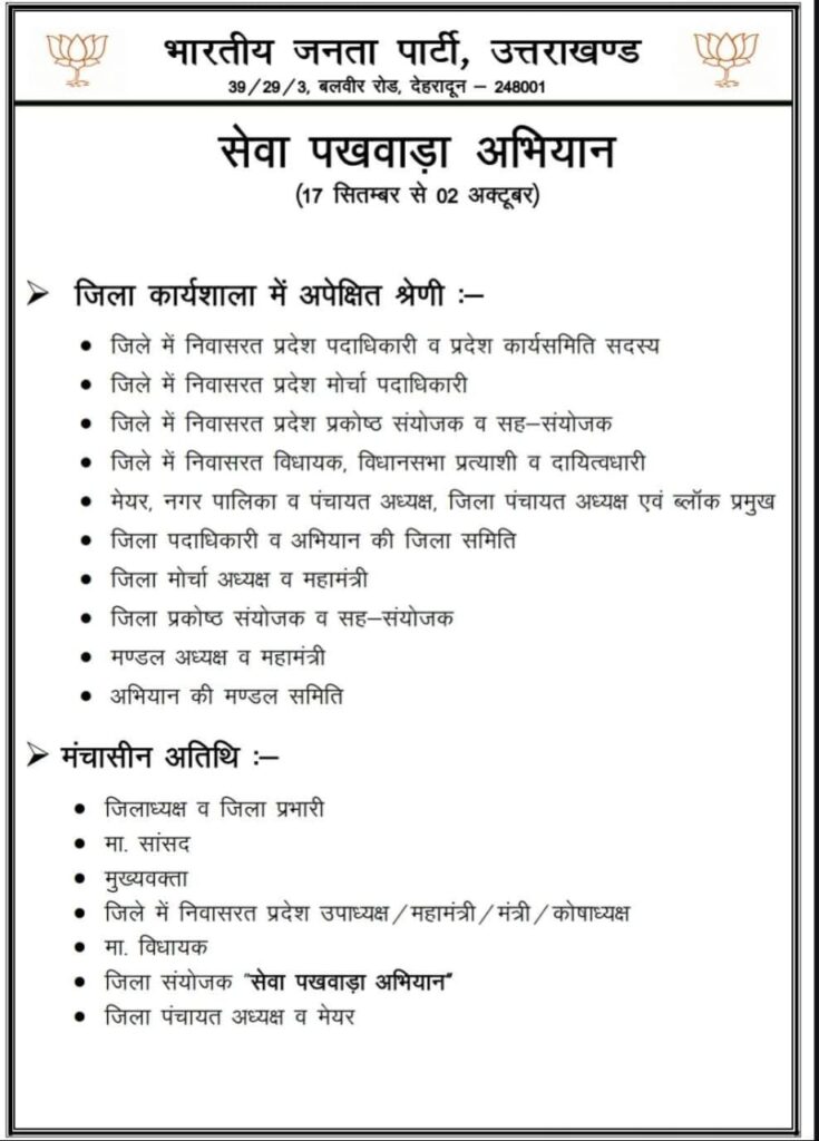 बैठक में यह भी तय हुआ कि जिले के प्रत्येक मंडल में कार्यकर्ताओं की टीमें गठित कर उन्हें अलग-अलग जिम्मेदारियां दी जाएंगी। इन टीमों के माध्यम से प्रत्येक कार्यक्रम का समुचित क्रियान्वयन सुनिश्चित किया जाएगा। जिला अध्यक्ष ने यह भी बताया कि प्रदेश स्तर से वरिष्ठ पदाधिकारीगण कार्यशाला में शामिल होंगे, जो सेवा पखवाड़े की गतिविधियों को और अधिक प्रभावी बनाने के लिए मार्गदर्शन करेंगे।