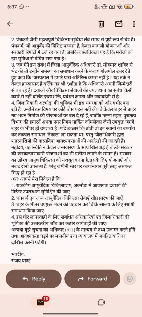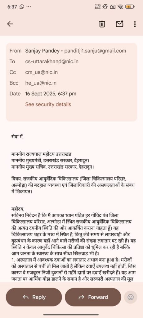 अल्मोड़ा के जाने-माने सामाजिक कार्यकर्ता संजय पाण्डे ने पंडित हर गोविंद पंत जिला चिकित्सालय परिसर में स्थित राजकीय आयुर्वेदिक चिकित्सालय की अत्यंत दयनीय स्थिति और प्रशासन की गंभीर लापरवाही को लेकर राज्य के उच्चाधिकारियों के समक्ष शिकायती पत्र प्रस्तुत किया है।