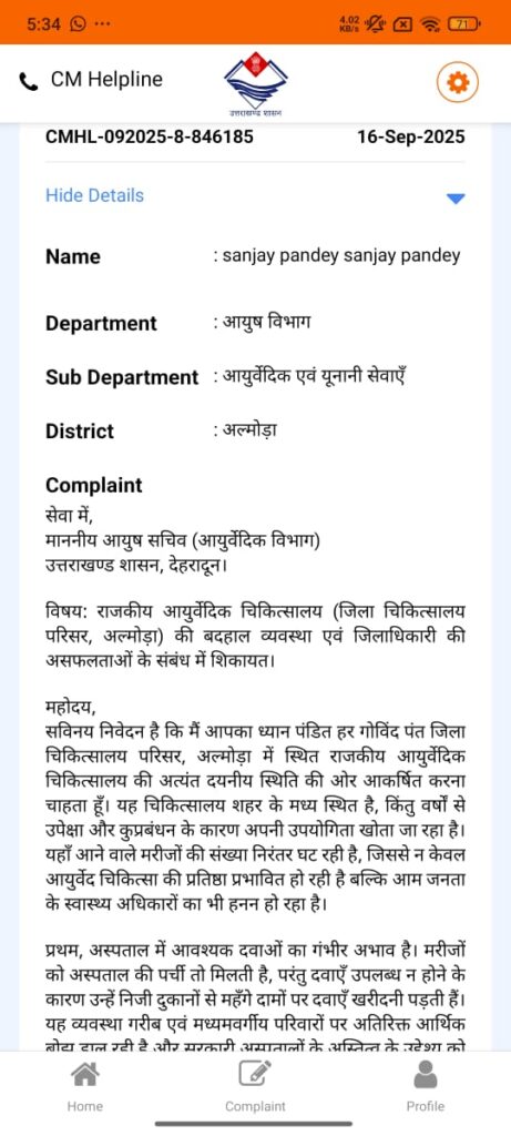उन्होंने बताया कि इस संबंध में उन्होंने मुख्यमंत्री हेल्पलाइन (क्रम संख्या CHML0920258846185), ईमेल और व्हाट्सएप के माध्यम से भी शिकायत भेजी है।अल्मोड़ा के जाने-माने सामाजिक कार्यकर्ता संजय पाण्डे ने कहा, “जनहित के मामलों में हम कभी समझौता नहीं कर सकते। हमारी प्राथमिकता हमेशा अल्मोड़ा के नागरिकों का स्वास्थ्य और कल्याण रहा है। यह चिकित्सालय उचित सेवाएँ प्रदान करने में विफल है और इस पर तुरंत कार्रवाई की जानी चाहिए।”
