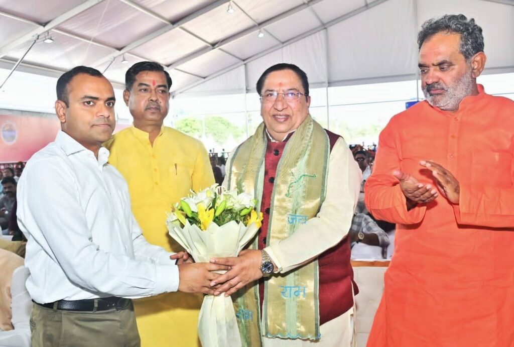 मुख्य अतिथि राज्यसभा सांसद नरेश बंसल का जिलाधिकारी मयूर दीक्षित ने पुष्पगुच्छ भेंट कर किया स्वागत