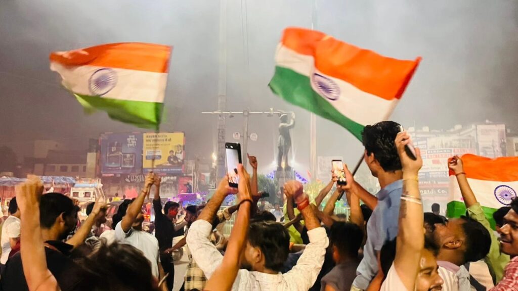 लोगों ने तिरंगा लहराते हुए “इंडिया-इंडिया” के नारों के साथ जीत का जश्न मनाया। घंटाघर क्षेत्र में कुछ देर के लिए जाम जैसी स्थिति भी बन गई। कई वाहन चालक भी अपनी गाड़ियों से बाहर निकलकर जश्न में शामिल हो गए और नाचते-गाते नजर आए। कई स्थानों पर लोगों ने मिठाइयां बांटकर एक-दूसरे को बधाई दी।